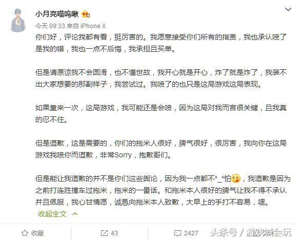 昨晚,虎牙王者荣耀主播小月亮在直播的时候,与斗鱼前王者荣耀职业选手拖米排位排到一起了,然而在游戏过程中,小月亮怒喷拖米带乱节奏,并随意骂人,引起很大的争议,而今天小月亮道歉,然而无关痛痒的道歉并未能得到拖米粉丝的谅解。