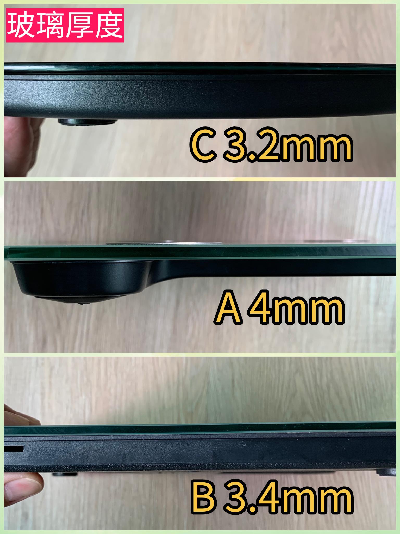 ABC都是使用钢化玻璃,A玻璃厚度是4mm,B厚度是3.4mm,C厚度是3.2mm。大多数常规体脂秤/体重秤的钢化玻璃都是5mm。平价嘛,肯定会在某些方面压榨成本,但大多数消费者也不关心玻璃厚度。