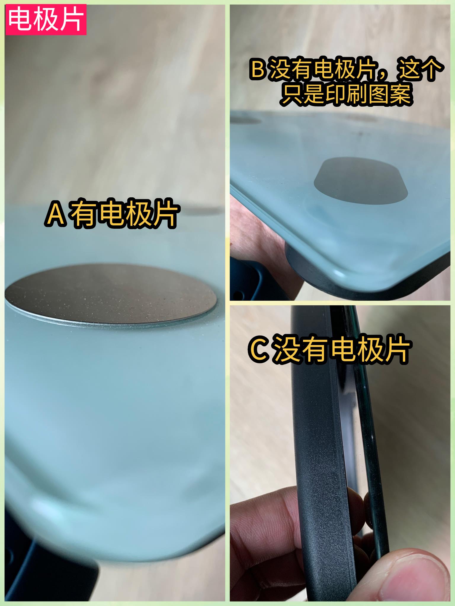我们可以基于这个简单判断体脂秤是不是智商税。A是有电极片,B没有,C没有。B的电极片是印刷图案,不懂的小白会以为这就是电极片,C是印刷图案都懒得弄。有人会有疑问,使用ITO导电玻璃的,不需要电极片。是的,但这个价格是不可能买到使用ITO玻璃的体脂秤。因此,BC是智商税,不接受任何反驳。