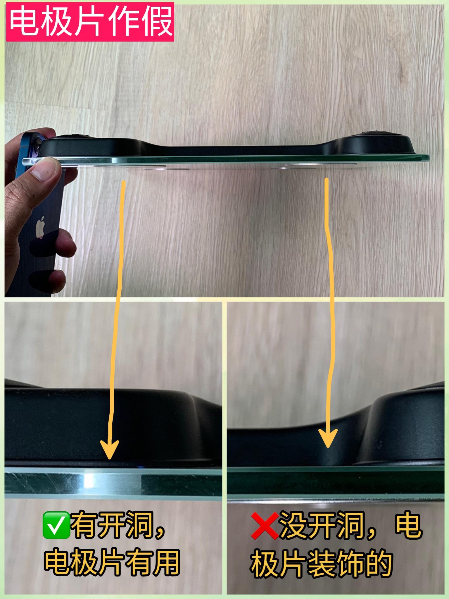 我在想,在这个价位,A基本是完胜的,那它为什么可以这么低价呢?4mm的钢化玻璃是一方面(它家其他产品基本没有4mm的),还有假的电极片。这款秤面有4块电极片,但有两块是假的。怎么样判断呢?用手机打开电筒,从玻璃侧面照进去,有开洞痕迹的,电极片是真的,没有开洞痕迹的,电极片是单纯黏上去的,装饰用的。