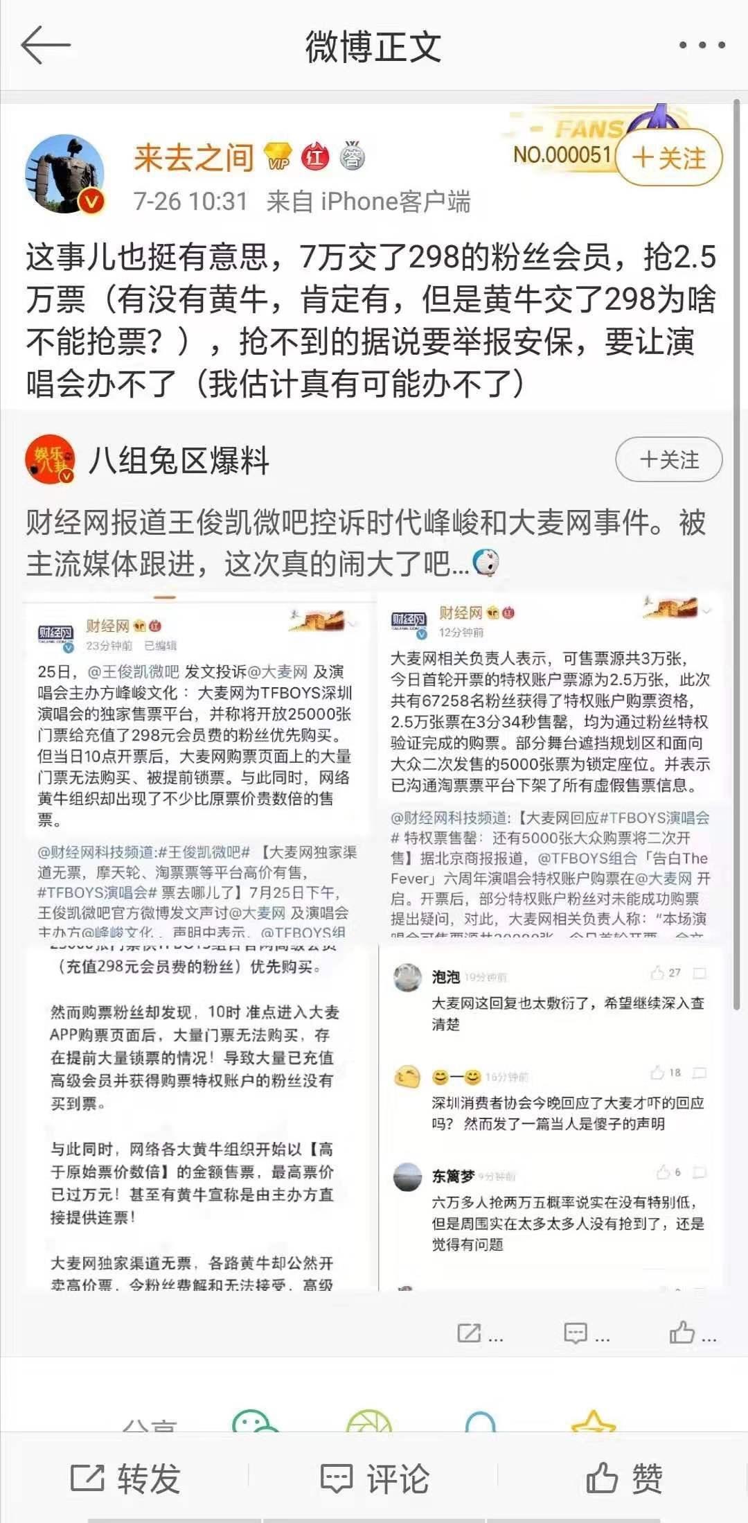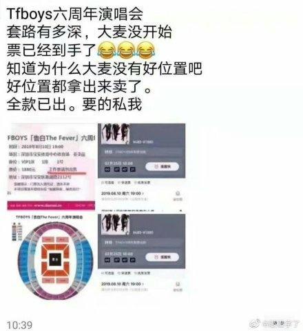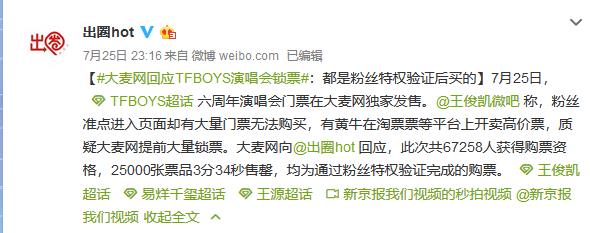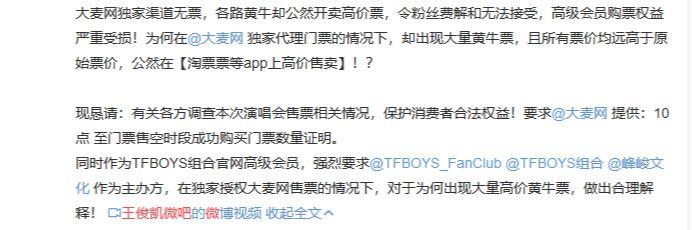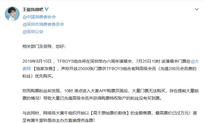 7月25日,TFBOYS六周年演唱会门票在大麦网独家发售。@王俊凯微吧称,粉丝准点进入页面却有大量门票无法购买,同时有黄牛在淘票票等平台上开卖高价票,质疑大麦网提前大量锁票。
