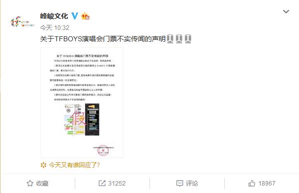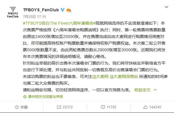 随后,tfboys公司发文澄清称,本次售票严格按照《六周年演唱会购票说明》执行,并在售票完成后由大麦网进行购票情况筛查对比,已尽可能提高特权账户购票数量并确保特权账户购票权益。声称近期将发布本次售票情况的详细说明情况。而针对粉丝举报的高价出售本次演唱会门票的行为,也将尽快核实并联络官方平台进行下架处理,并与粉丝共同抵制一切售假及高价出售演唱会门票的行为。