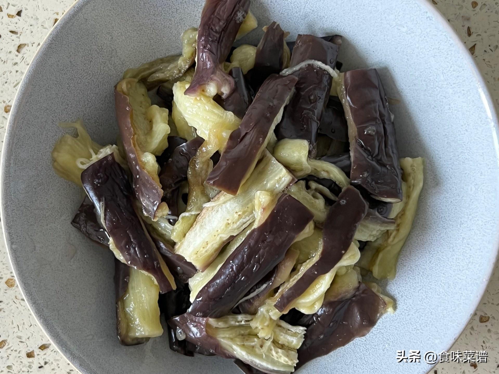 1、准备两个茄子,不用刮皮,用盐水搓洗一遍,去掉脏东西,改刀切成长条,上桌蒸15分钟,蒸熟蒸透,把茄子装入盆中。