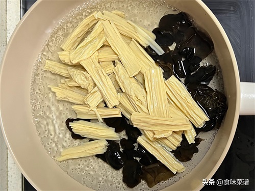 1、准备适量的腐竹和黑木耳,用清水浸泡2个小时,泡软泡胀,起锅烧水,水开放入木耳和腐竹,大火焯烫几分钟,捞出冲洗一遍,控干水分。