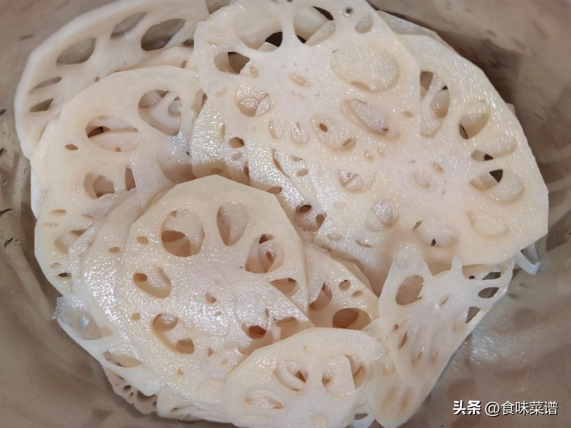 1、准备两节莲藕,刮掉外皮,改刀切成薄片,越薄越好,马上放入凉水中浸泡,避免氧化发黑,起锅烧水,水开放入藕片,焯烫一分钟,冲洗一遍,捞出控干。