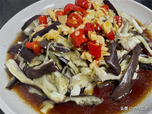 2、上面铺一层蒜末和小米椒,淋入热油激发出香味,调味加食盐、生抽、香醋、鸡精和芝麻香油,再次搅拌均匀,茄子就凉拌好了,绵软鲜香,营养丰富,开胃下饭。