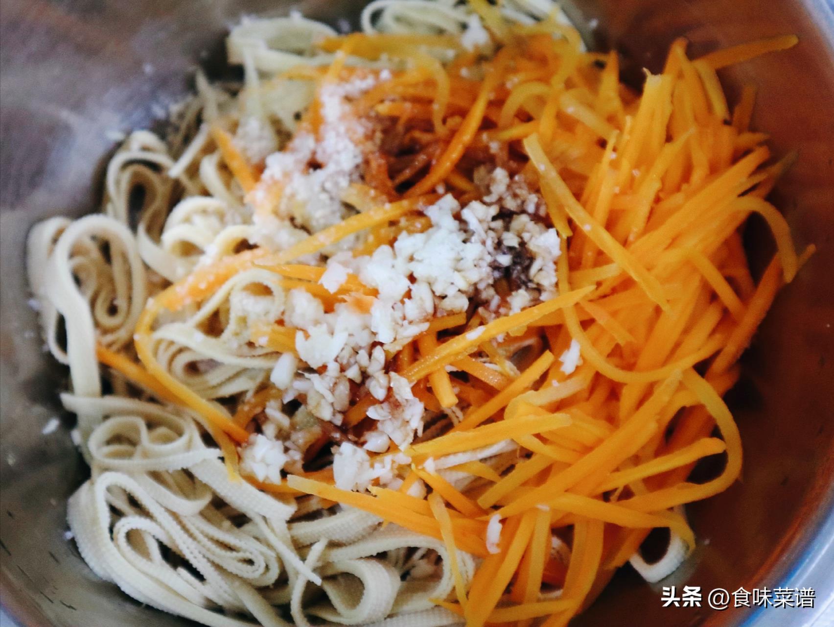 1、准备一张豆腐皮,改刀切成细丝,另外准备一个胡萝卜,刮掉外皮,改刀切丝,起锅烧水,水开放入豆腐丝焯烫2分钟,把胡萝卜丝也烫一烫。