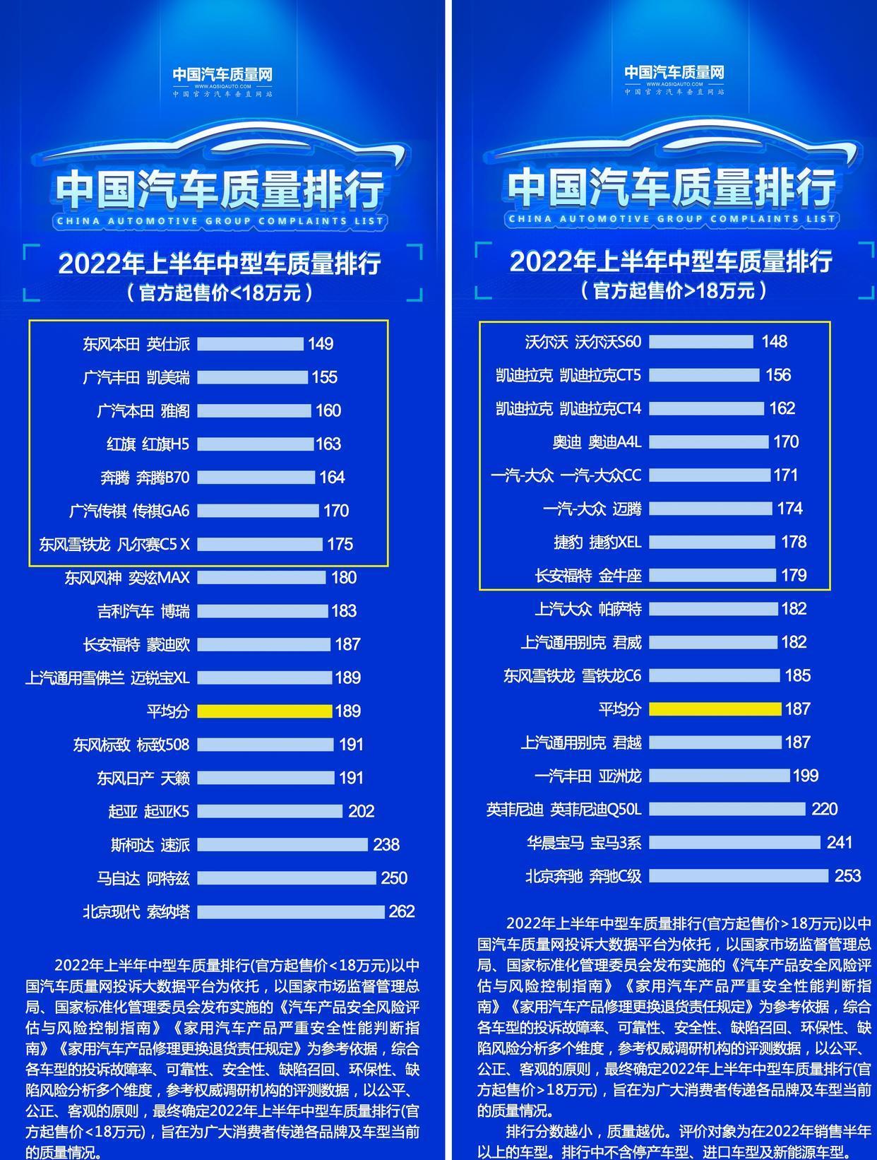 导读:近几年,国内消费者在选购车型时,都非常注重它们的品质表现,所以空间和品质都表现不错的B级车,就成为了很多年轻消费者的购车首选。当然,并不是所有的B级车都值得认可,根据“中国汽车质量网”发布的B级车质量榜单来看,质量排行分数低于180的车型共有15款,主流车型丰田凯美瑞、本田雅阁、奥迪A4L和大众迈腾全部上榜,大众帕萨特、别克君威、福特蒙迪欧以及雪铁龙C6等车型,质量表现也比较出色,但令人比较意外的是,日产天籁、别克君越、丰田亚洲龙、宝马3系以及奔驰C级等B级车,质量排行分数反而都超过了行业平均值。官宣!质量可靠的十五款B级车,凯美瑞领先雅阁,奥迪A4L迈腾上榜!