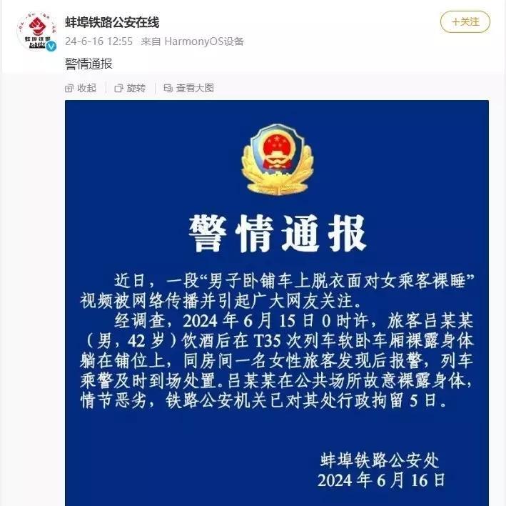 6月16日,蚌埠铁路公安处针对此事发布了正式的警情通报,确认了该男子吕某某(42岁)确实在酒精作用下,在列车软卧车厢做出了不当行为。鉴于其行为性质恶劣,影响极坏,铁路公安机关依法对其处以行政拘留5日的处罚。