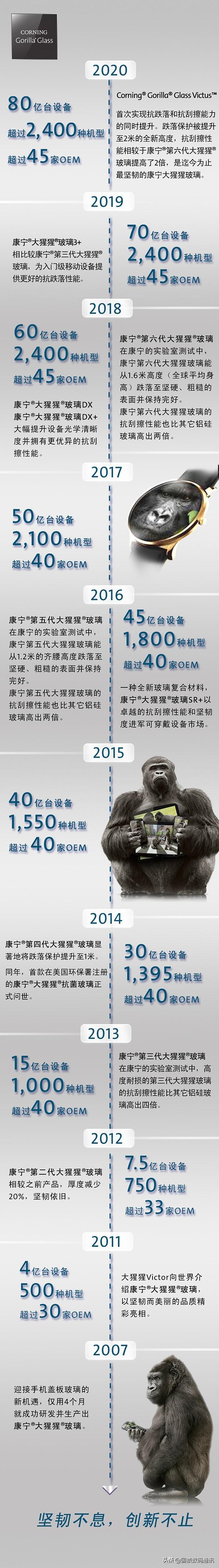2007年第一代手机康宁大猩猩玻璃被应用;2012年消费电子展会(CES)上,康宁推出了第二代大猩猩玻璃;2013年CES上,康宁推出第三代大猩猩玻璃,具备“原生防损”技术;2014年11月,康宁推出了第四代大猩猩玻璃。实验中从1米高处掉落时,其完好率仍可保持在80%;2016年7月,康宁推出第五代大猩猩玻璃。当屏幕正面朝下从1.6米的高度跌落到粗糙表面,其完好率能达到80%;2018年7月,康宁推出其第六代大猩猩玻璃,试验中1米高度进行15次摔落,保持完好,比大猩猩5要好两倍;2020年7月23日 , 康宁公司推出了其在玻璃技术方面的最新产品: Victus™。