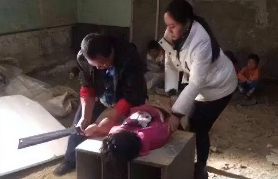这个被抓来的小女孩不听话,人贩子准备要用长刀砍小女孩的手,