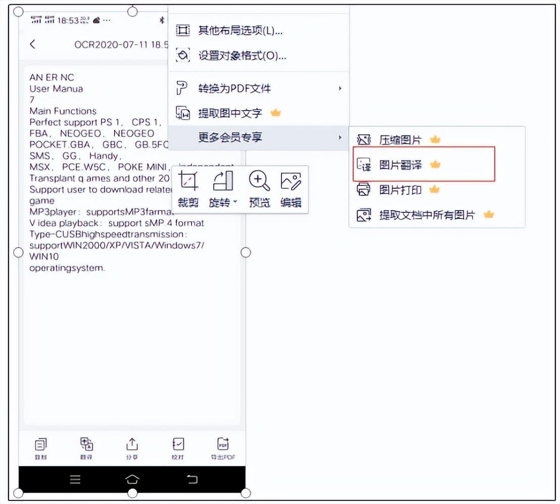 然后点击图片,选择右侧功能中的更多会员专享,可以看到图片翻译功能。