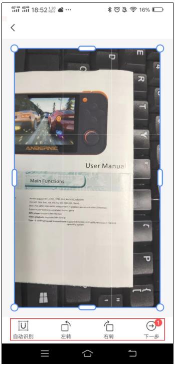 然后进行拍照,拍摄需要进行翻译的英文图片,这里还可以对图片进行简单的处理,比如左转右转,对图片裁剪处理,随后点击下一步。