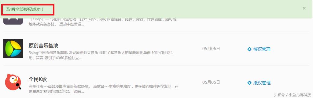 3.点击“确认”,显示“取消全部授权成功”,结束。