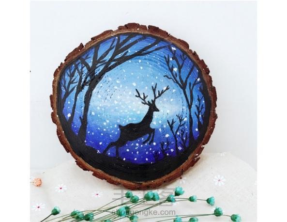 用记号笔把树杈画出来,注意形态不一,用铅笔勾出麋鹿形状,用记号笔填色最方便,点上白颜料,像星空的亮点。完美收工。