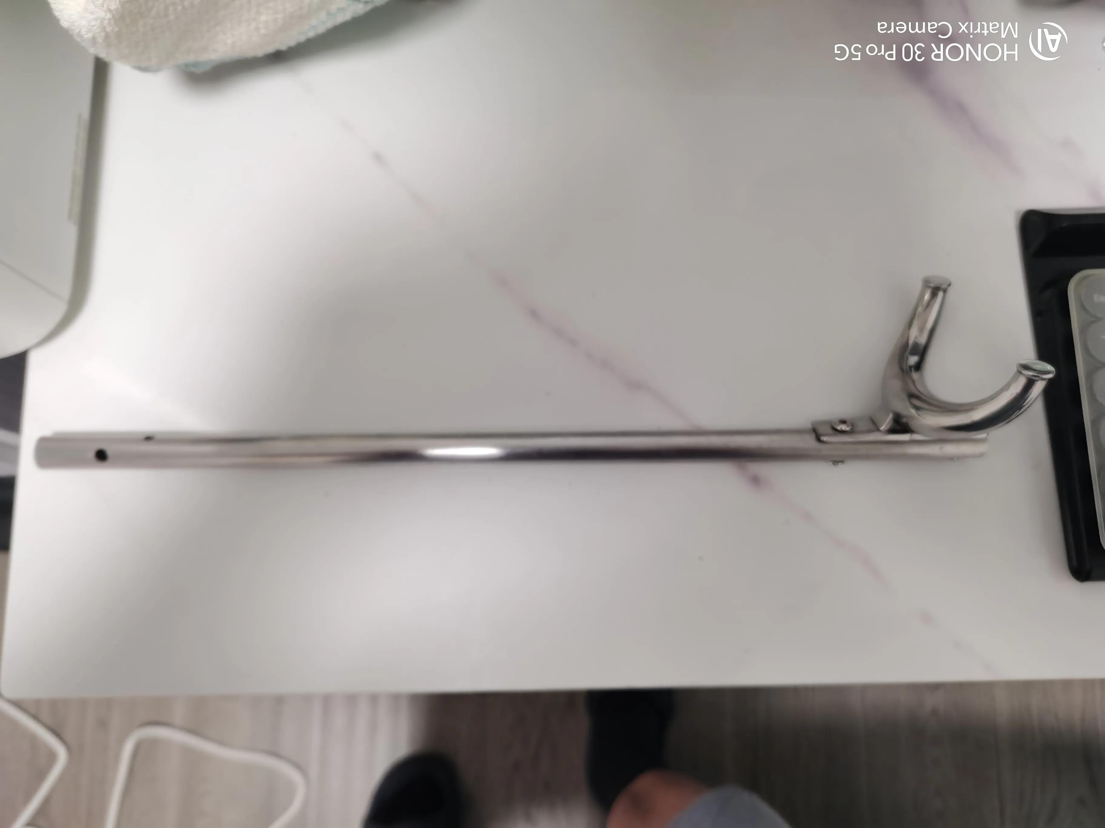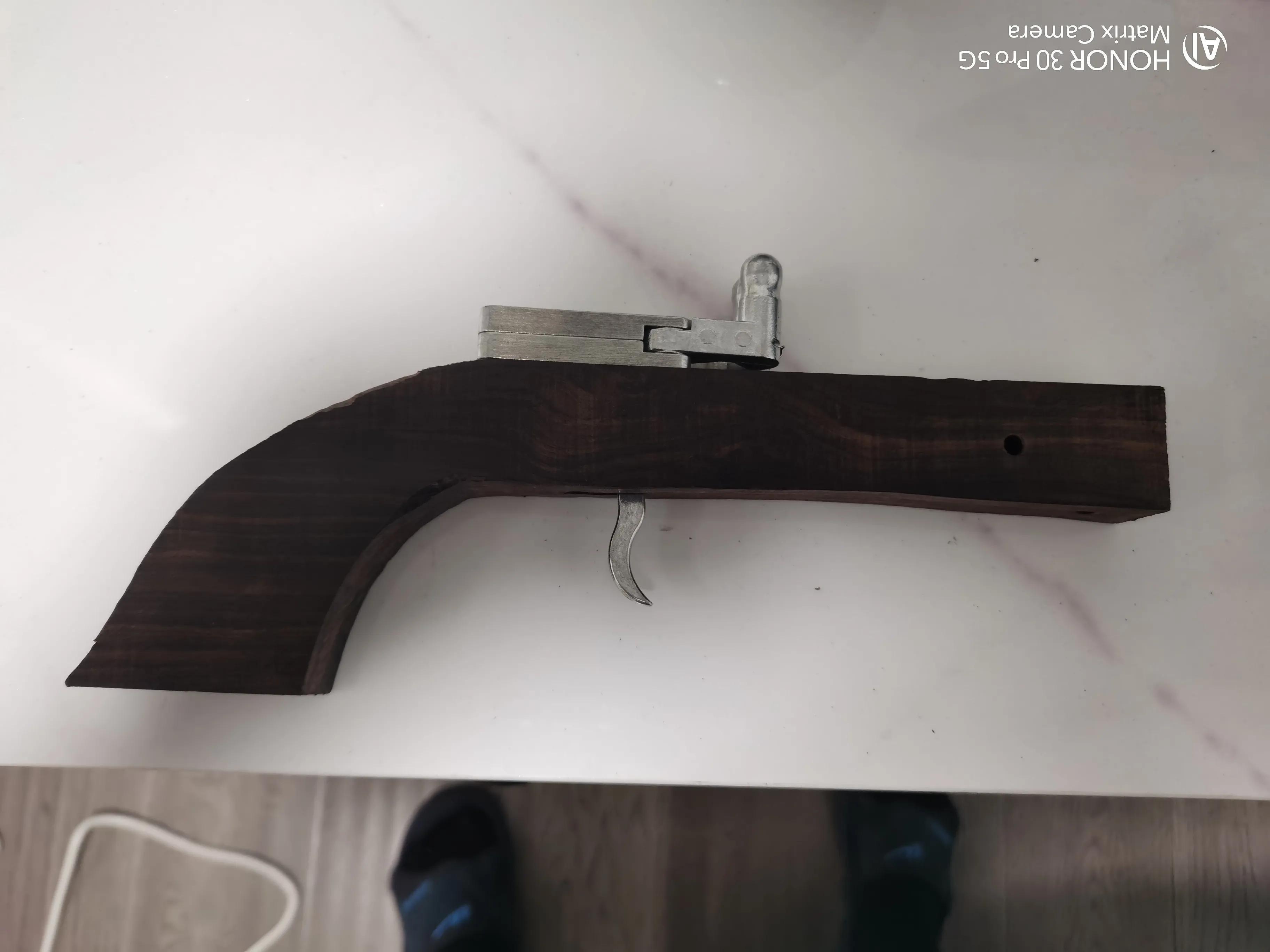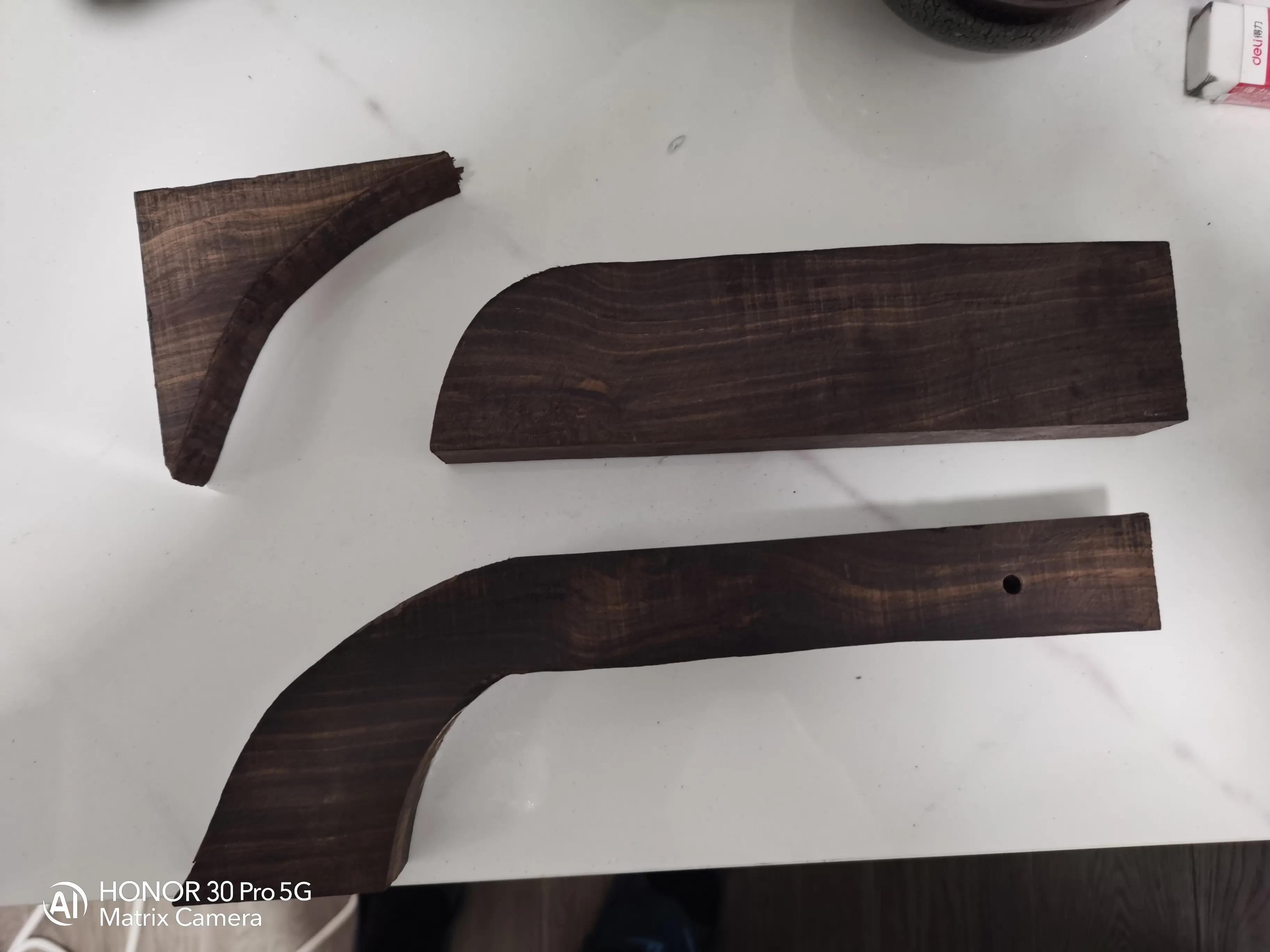 网上看了好几个制作弹弓的帖子,我也自己做了一把,紫光檀木板长25宽8厚2.5厘米,自己画的形状,曲线锯开出形状,旋转锉找平,三百目六百目一千目砂纸抛光,用火烘热,涂蜂蜡,通体打均匀,准备一根1.4厘米粗35厘米长壁厚两毫米的不锈钢管。弹弓头,M4螺丝铜预埋螺母,长度从12毫米和25毫米两种。装订螺母对应螺丝数量买。其后看图打孔。