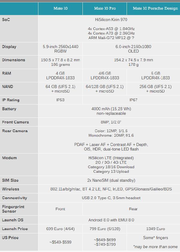 现在,外媒AnandTech整理了一张规格表,详细的介绍了华为Mate 10、Mate 10 Pro和保时捷设计版这三款手机之间差异。