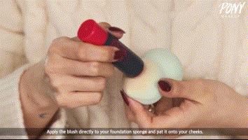 将涂过粉底的海绵蛋沾取腮红膏轻轻在两颊轻拍晕染,如果没有腮红膏,用口红也可以替代哦~