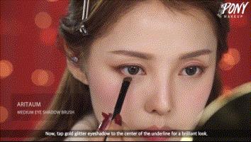 接下来用带闪的金色眼影,点涂在下眼线的中间部分,打造亮晶晶的感觉!