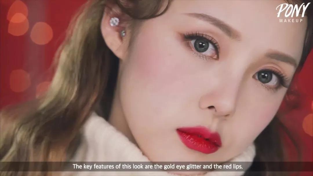 这款圣诞妆容的重点在于眼部、眼下的珠光粉和红唇,呈现非常浓烈的圣诞氛围~