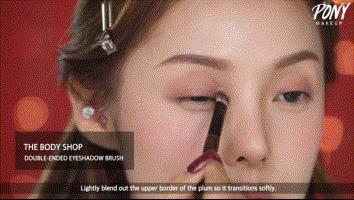 将灰棕色眼影涂在酒红色眼影上方,将酒红色眼影的分界线柔和地晕染开