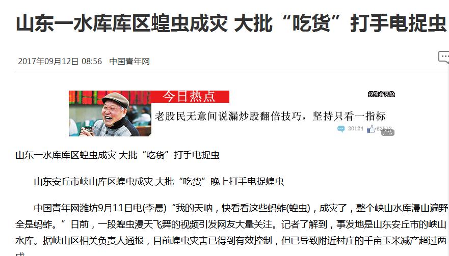 已经很长时间没有听说过蝗虫灾害的消息了,但这两天看到两条关于蝗灾的新闻,一条是山东潍坊峡山地区出现了蝗灾,不过是那里的农民却不怒反喜,因为每天光靠捕捉蝗虫卖钱就能挣好几百块钱,而且自己也能捉来吃,这简直是天降好运,这在以前的时代是不可想象的。