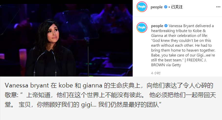 动作科比的浑家,瓦妮莎也是初次上台报告,遗失夫君和女儿的她顽强的站在台上,赢得了全场瞅众的饱舞。瓦妮莎对于科比的是布满不舍的,一句“她是我的十足”不觉让现场瞅众降泪。