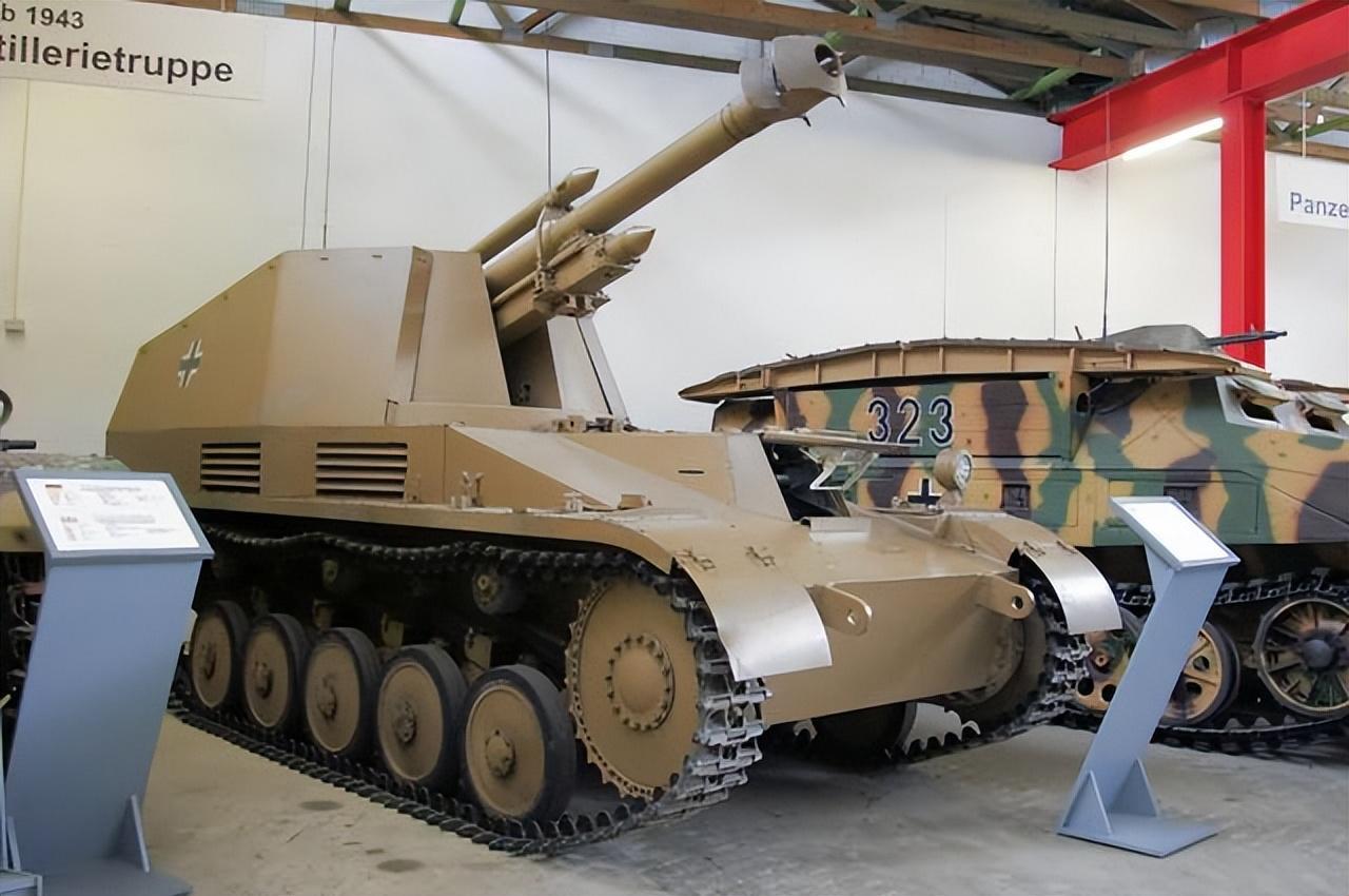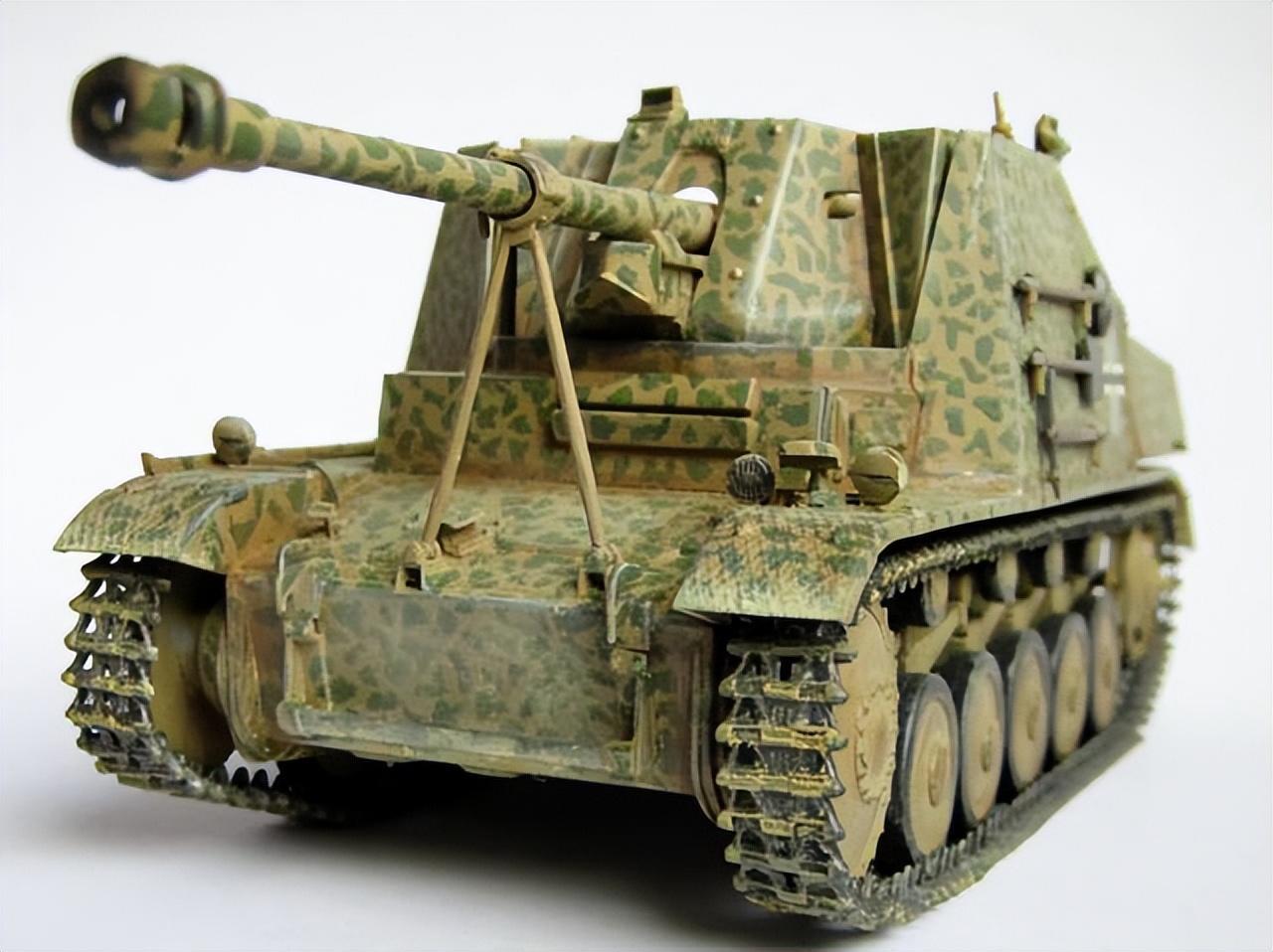 黄蜂式自行火炮(二号Wespe),重12吨,搭载一台迈巴赫140马力汽油机,时速40公里,主武器为105毫米口径榴弹炮,乘员5人。黄蜂式同样为二号坦克的变体,服役于1943年,在战争中后期,由于盟军坦克质量的飙升,二号坦克在各项指标上都大有不如,再加上己方虎豹装甲也已经大规模投入使用。因此,该装甲逐渐退居二线,后来为弥补德军炮兵的实力,不少二号坦克被改装成自行火炮,而黄蜂式的总量产则为682辆。