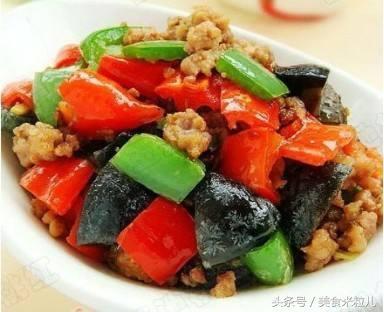 3.先炒肉末,变色后敏捷盛起,锅内再加油,爆蒜末、干辣椒,投入青椒丁煸炒顷刻后参加皮蛋丁,加盐、生抽少量和炒好的肉末一起炒匀起锅即可。
