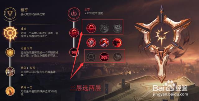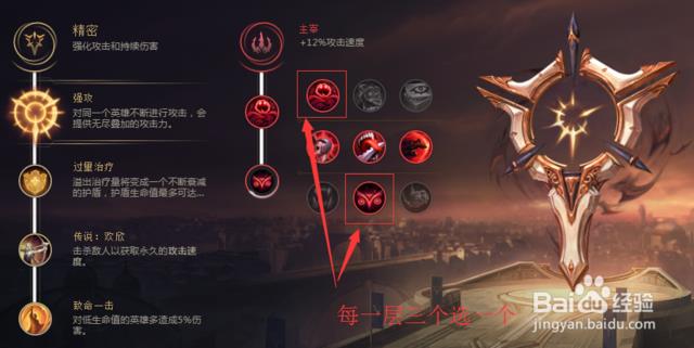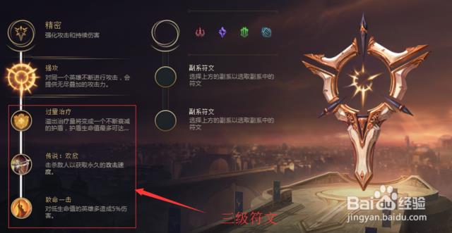 在选完了符文副系后,你可以为这个副系选择二级符文。你所选择的二级符文可以从该系的九个高级符文中选择。首先的三层选两层,然后每层三个选一个。这样你就完成了整个符文页的选择。