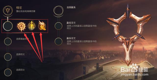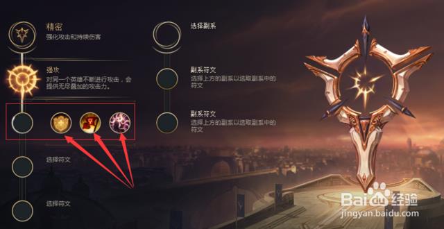 在你决定了符文系后,就会开始进行最重大的抉择——选择基石。每个符文系都有三个基石(启迪系只有2个)可以选择,具体能力我会在下个步骤栏目里列出,这里仅仅以“精密系”来举例子。图示有三个基石符文的图标可供选择。基石都是那些最为强大的符文,一共有3个,但是你只能从中选择一个。