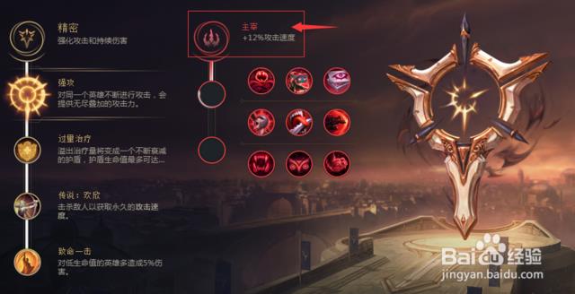 接着,你需要从余下的四个符文系中挑选一个作为“符文副系”,这里我选择了“主宰系”。这个副系的选择会为你带来一个固定的副系基石,你无法选择。从例图中可以看出主宰系的副系基石是+12%攻击速度。
