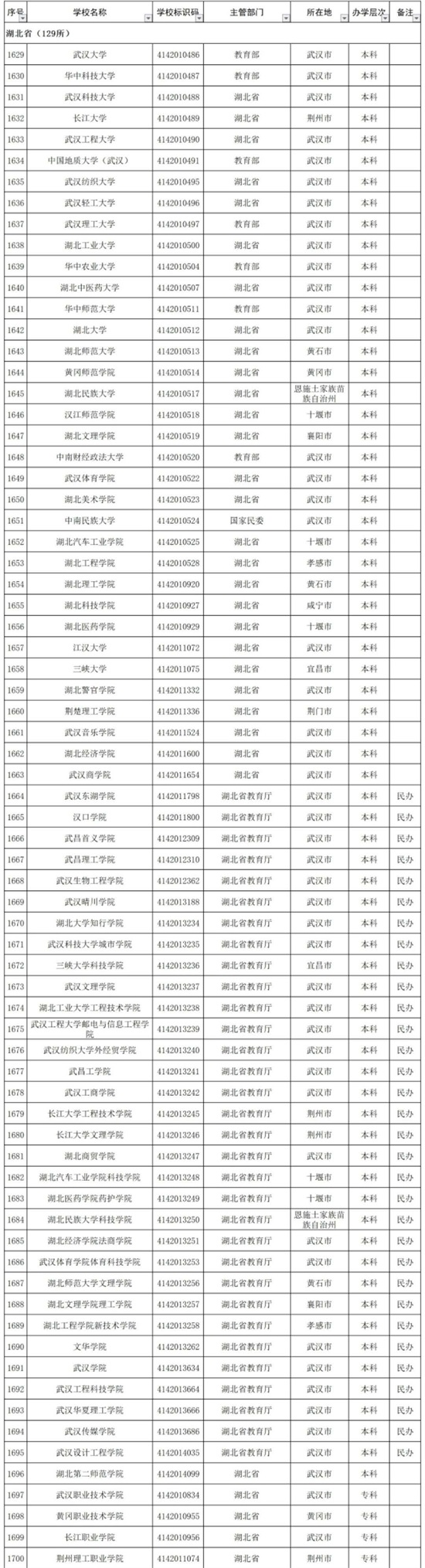 湖北境内的普通高等学校一共有129所,成人高等学校共有14所,合计143所,除此之外的其他高等学校皆视为“野鸡大学”,请同学们慎重考虑。