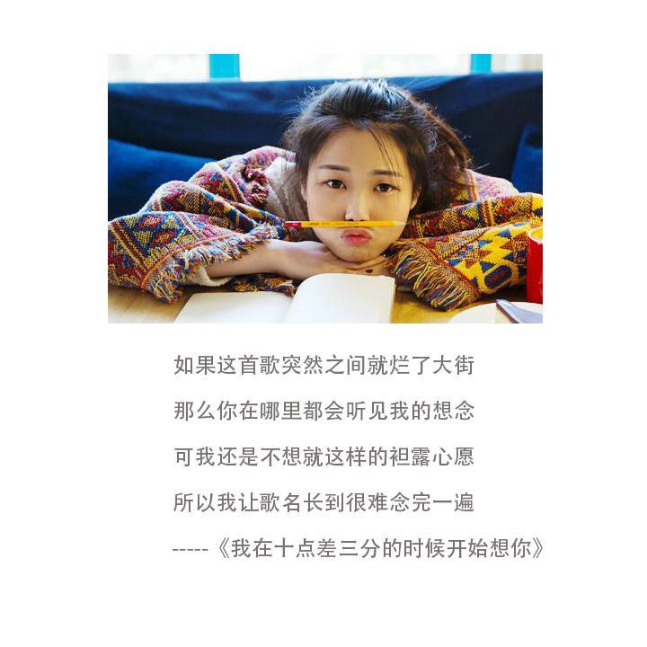 《我再十点差三分的时候开始想你》,第一次看到这个名字,念了几次也没有记住,后来才明白它暗含的意义:十点差三分,九点五十七,九五七,就爱你,如果你也听到这首歌,如果你也想知道这首歌名的意义,那你可不可以喜欢我。