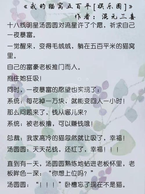 1.《我的猫窝五百平[娱乐圈]》 作者:混元三喜