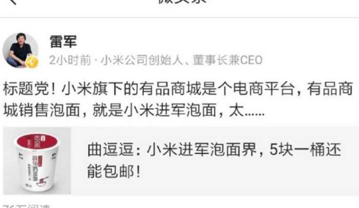 原因是小米电商平台上架了5元的泡面,正当人们议论纷纷的时候,雷军出来说话了。