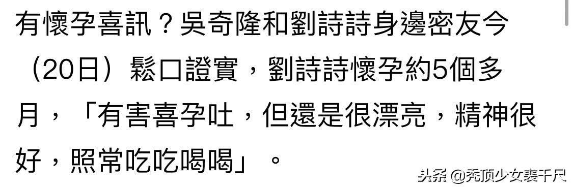 据台媒报,吴奇隆和刘诗诗的好友今日松口向媒体证实刘诗诗已经怀孕5个多月,“有害喜孕吐,但还是很漂亮,精神很好,照常吃吃喝喝”。