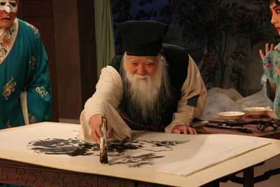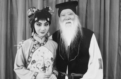 时光飞逝,进入20世纪九十年代,年过古稀的宋宝罗先生虽然很少有机会再粉墨登场,但仍然勤于书画创作,并十分热心地参加各项公益事业。凡是大型的赈灾义演、义卖、捐款捐物的活动,总少不了宋老鹤发童颜的身影。1991年,他十几年间创作的五千余幅作品被运往美国费城展出;1995年,在全国老龄委举办的全国老年艺术家汇演中荣获特等奖、牡丹奖、寿星奖,同年被评为浙江省十佳健康老人;1996年,宋宝罗八十华诞时,在浙江省博物馆举办了个人画展;1997年,他竟以长及胸腹的真胡须代替髯口演出《三娘教子》的薛保,一时传为梨园佳话(见图);2002年,宋老只身赴美探亲,并在哥伦比亚大学讲授京剧艺术,佛州中华文化活动中心和佛州华商总会长青社联合授予他“终身艺术成就奖”,宋老被美国华文报纸誉为“国宝级京剧书画名家”。