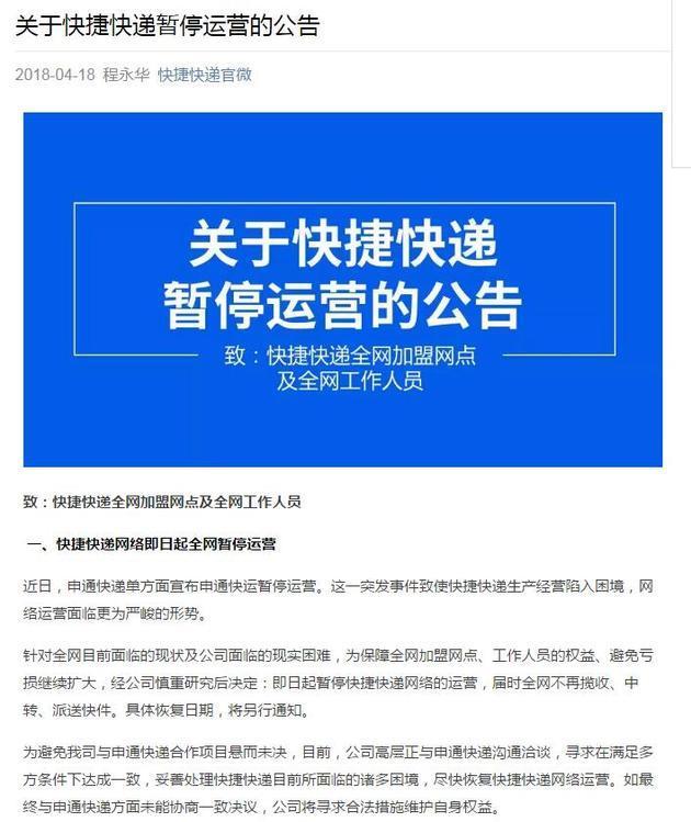 针对全网目前面临的现状及公司面临的现实困难,为保障全网加盟网点、工作人员的权益、避免亏损继续扩大,经公司慎重研究后决定:即日起暂停快捷快递网络的运营,届时全网不再揽收、中转、派送快件。具体恢复日期,将另行通知。
