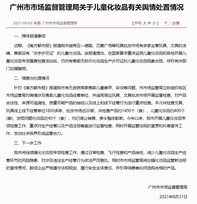 2021 年 8 月 31 日,广州市市场监督管理局发布《广州市市场监督管理局关于儿童化妆品有关舆情处置情况》(下称 " 处置情况 "),针对当时媒体报道的广州市存在有售卖无标示化妆品生产许可证的儿童化妆品等问题,广州市市场监督管理局随即对 1800 多家玩具线上线下经营单位、近 20 家批发市场开展监督检查,对产品合法性、来源可追溯性、质量可疑产品的抽检以及线上和线下经营行为进行重点检查,共检查产品约 1400 个(套),儿童化妆品约 400 个 ( 套 ) ,发现问题化妆品近 40 个(套),均已停止销售,责令整改数家。