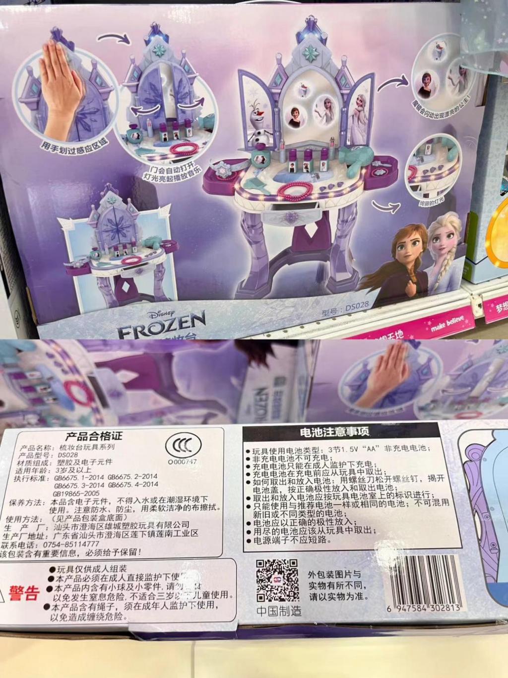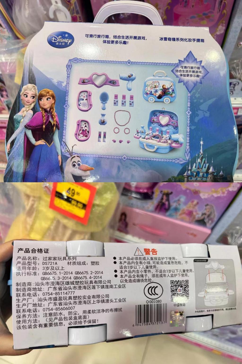 其中一款迪士尼冰雪奇缘系列化妆手提箱,外包装显示产品内含有梳子、项链、镜子等,还包含两支唇彩和三瓶指甲油。产品名称标为 " 过家家玩具系列 ",执行标准为 GB6675.1-2014、GB6675.2-2014 等,均为玩具安全的国家标准。