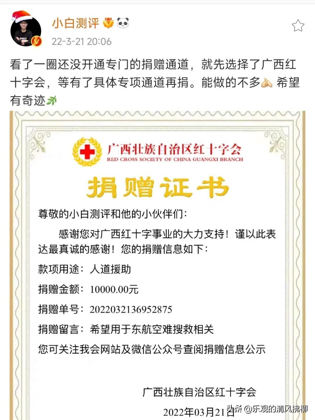 最后,小白还说要向事故发生点的广西红十字会捐款,随即还晒出了捐款赠书,想通过做好人好事来洗白自己。但是,此次东航空难事故和一般的自然受灾并不一样,国家第一时间派出了搜救队伍,哪里还需要他的一点点微薄的捐助。他捐钱卖好的目的已是昭然若揭。
