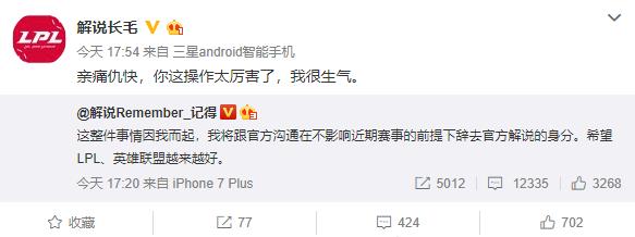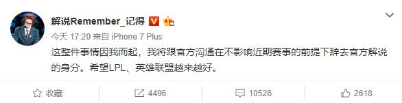 且不说这次事件的影响至不至于让她辞职,更令人震惊的居然是记得随后就在其微博也表示将辞去LPL解说一职!!!