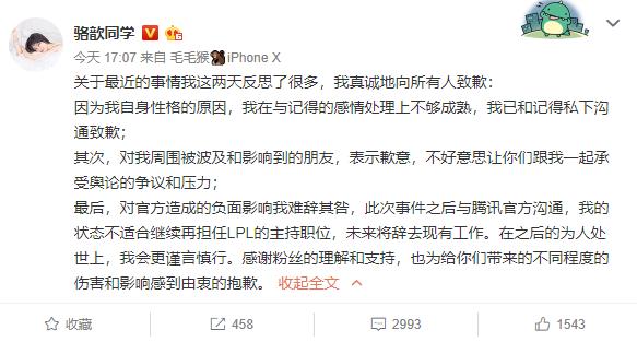 然而就在两个小时前,骆歆终于对此事在其微博做出了回应,而回应的内容真扎心了,她竟然直接辞去了LPL主持人一职。