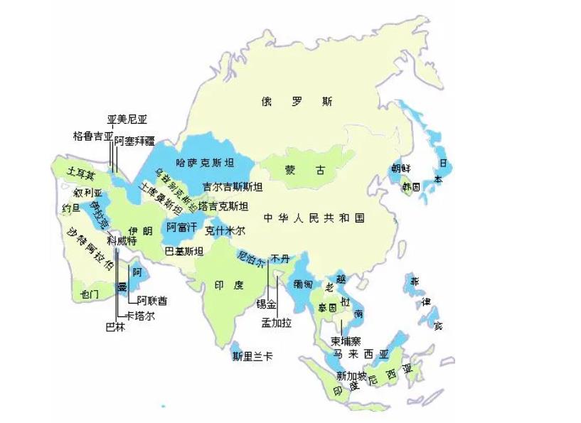 朝鲜、蒙古、越南、印度、印度尼西亚、缅甸、巴基斯坦、阿富汗、尼泊尔、叙利亚、也门,、斯里兰卡、柬埔寨、伊拉克、老挝、科威特、土耳其、伊朗、黎巴嫩、日本、马尔代夫、马来西亚、菲律宾、泰国、孟加拉国、约旦、阿曼、阿联酋、卡塔尔、巴勒斯坦、巴林、沙特阿拉伯、新加坡、文莱、乌兹别克斯坦、哈萨克斯坦、塔吉克斯坦、吉尔吉斯斯坦、土库曼斯坦、以色列、阿塞拜疆、亚美尼亚、格鲁吉亚、韩国、东帝汶。