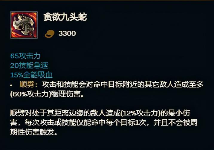 最后是九头蛇,技能和普攻都能够触发额外伤害,而且提供15%的全能吸血,算是一件科技枪的替代品,但不可忽视的是:这件装备同样有强大的AOE范围伤害。