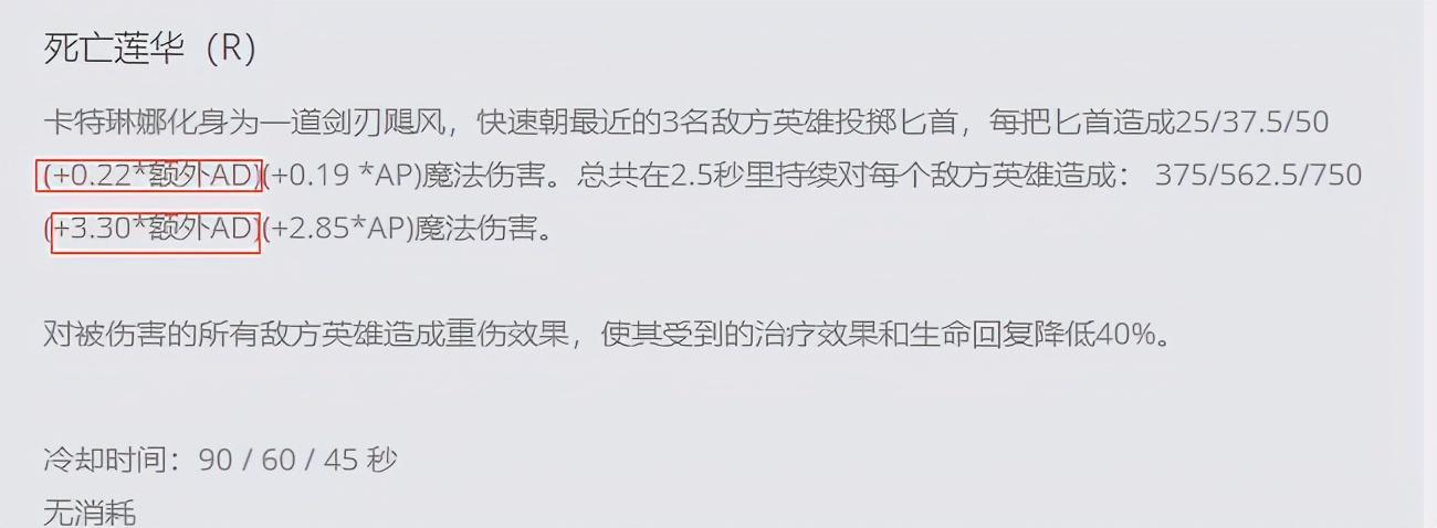 卡特能够出AD装备的主要原因,便在于卡特的被动、Q、E、R四个技能,均有AD加成,并且R技能的AD加成,比AP加成,还要高出0.48。