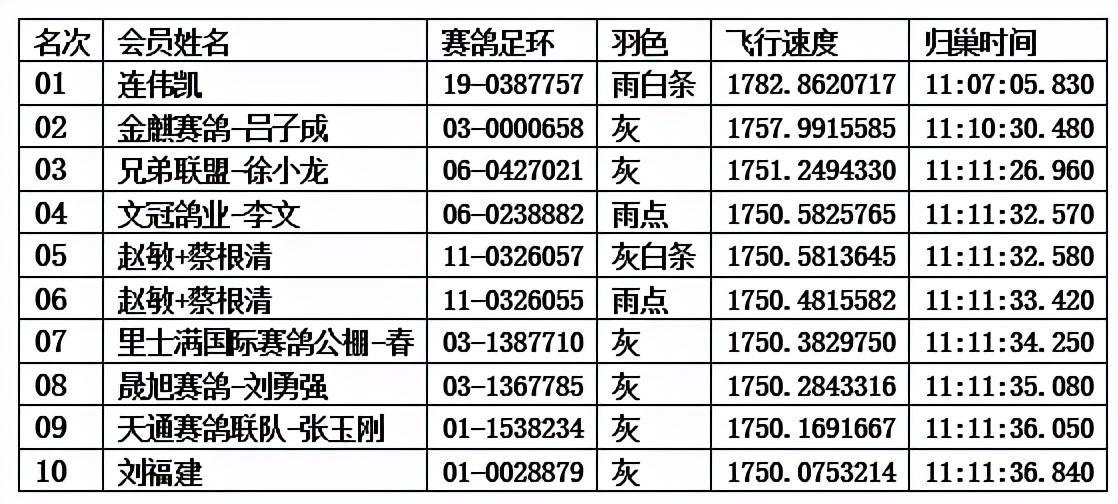 继冠亚军报到之后,开尔勇士大部队浩浩荡荡归来,兄弟联盟-徐小龙先竹名下战将,环号为06-0427021的灰鸽在群雄中奋勇争先喜获季军。文冠鸽业-李文先生的爱将则名列殿军。浙江名家赵敏+蔡根清强强联合合则来了个双响炮、连夺5名、6名的好成绩。