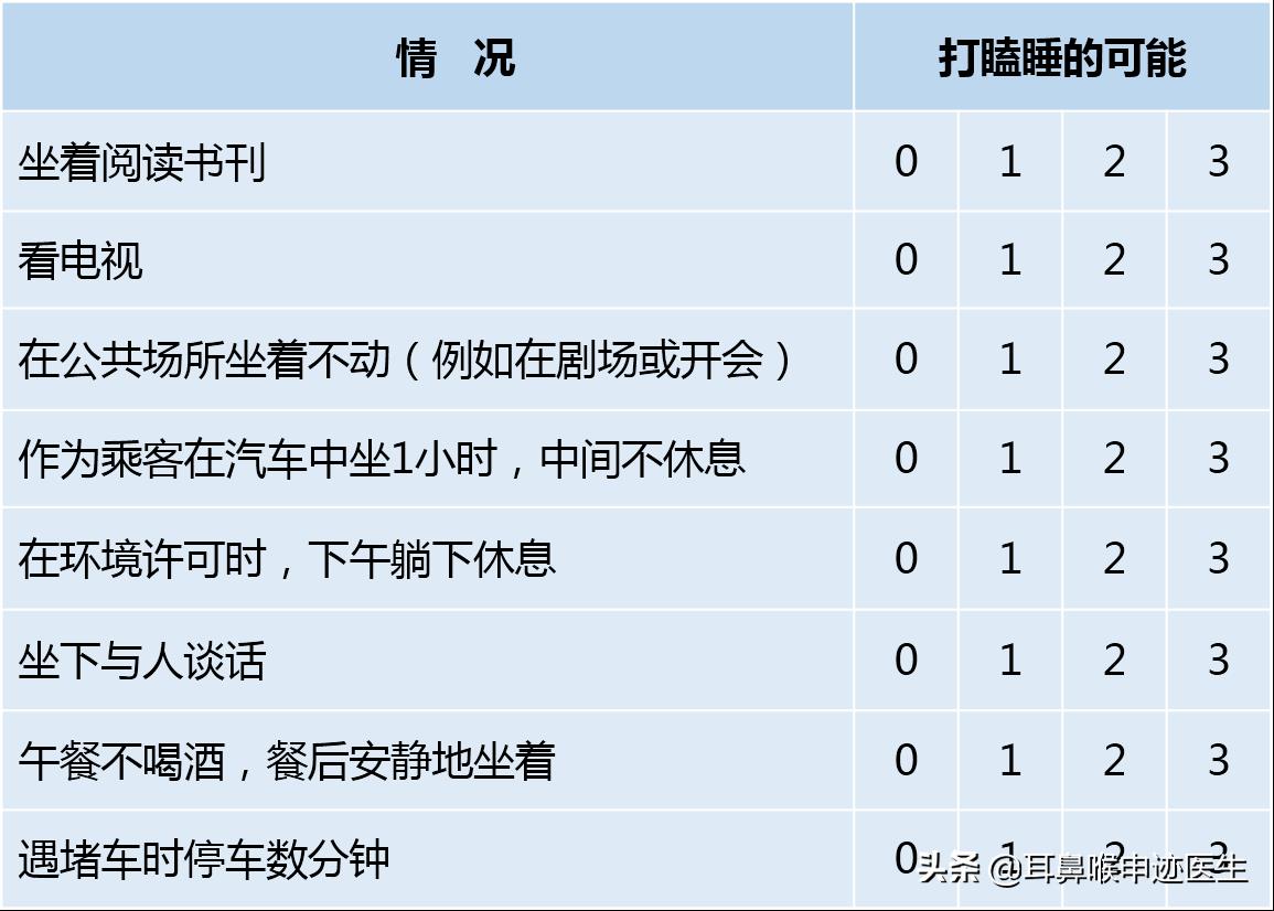 睡眠呼吸暂停综合征前面的帖子我已经详细介绍过了,睡眠呼吸暂停综合征一般会导致一个明显的症状,在我们生活中都可以观察到的,就是嗜睡,我们可以用下面的方法自测一下(70岁以上老人打盹不在此自测范围内)。