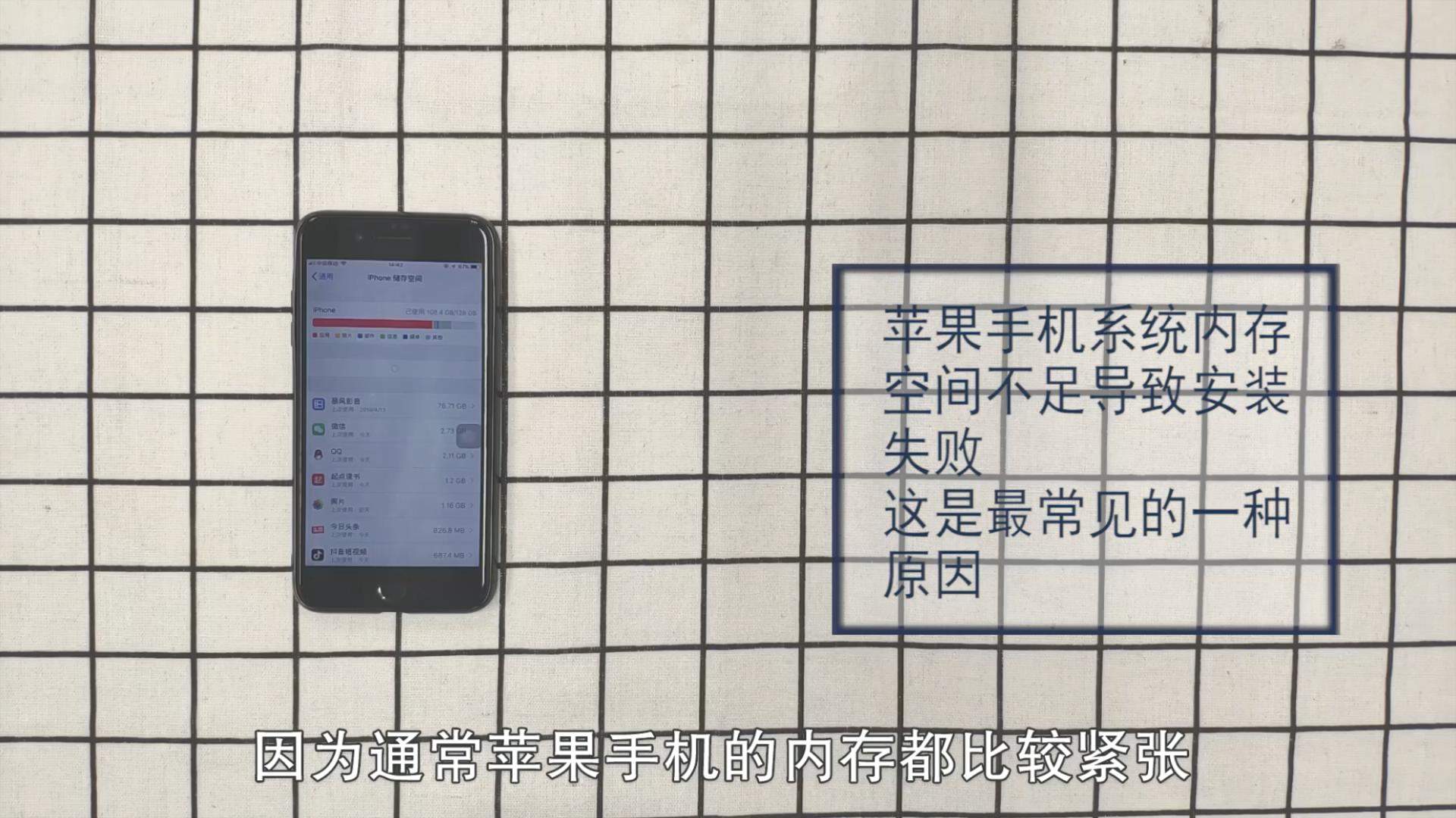 1、苹果手机系统内存空间不足导致安装失败,这是最常见的一种原因,因为通常苹果手机的内存都比较紧张;